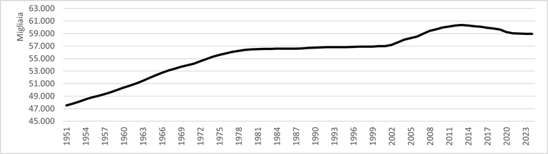 Per inquadrare correttamente l’evoluzione recente è utile partire dalla serie storica lunga. Dopo la forte crescita del secondo dopoguerra, da 47 milioni di abitanti a 57 milioni, a partire dagli anni Ottanta la popolazione italiana entra in una fase di sostanziale stabilizzazione. Per circa vent’anni il numero di residenti oscilla intorno a valori relativamente costanti, riflettendo un equilibrio fragile tra una natalità già in calo e il progressivo allungamento della speranza di vita. Questo equilibrio si rompe nei primi anni Duemila, quando la popolazione residente torna a crescere in modo sostenuto, tra il 2001 e il 2013 l’Italia passa da 57 milioni a circa 60,34 milioni di abitanti, raggiungendo il massimo storico proprio nel 2013.