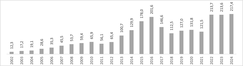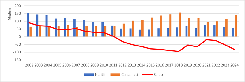 A peggiorare il quadro demografico contribuisce anche il bilancio migratorio con l’estero dei residenti italiani che dal 2012 diventa negativo iniziando a peggiorare molto rapidamente. Tra il 2012 e il 2018 la perdita netta di popolazione italiana per effetto dei trasferimenti all’estero cresce in modo continuo, raggiungendo i valori più elevati alla fine del decennio. Negli anni successivi il disavanzo si riduce, arrivando quasi al pareggio, ma si tratta di una fase temporanea. Dal 2022 il saldo torna a peggiorare con decisione e nel 2024 raggiunge un valore particolarmente critico, circa 82.600 italiani in meno in un solo anno. Tra il 2012 ed il 2024 si registrano circa 1,551 milioni di cancellazioni verso l’estero a fronte di 763 mila iscrizioni, con una perdita netta di circa 787 mila cittadini italiani, ed aggiungendosi al saldo naturale negativo contribuisce in modo significativo ad accelerare il declino demografico in atto.
